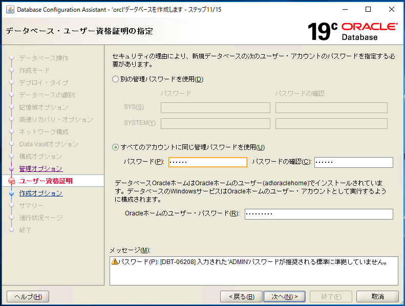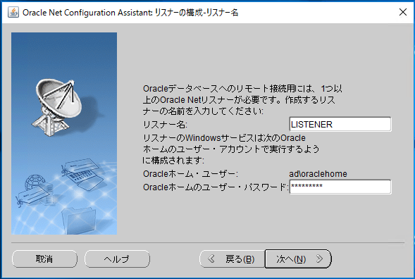 その後のリスナー作成やDB作成ではドメインのOracleホームユーザのパスワードが求められる。