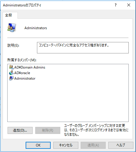 Databaseをインストールするホストをこのドメインに参加させたうえで、ローカルのAdministratorsグループにインストールユーザを追加しておく。ドメイン側でDomain Adminsグループに入れてもよさそうではあるが、いずれにしても管理者グループのメンバとして登録しておかなければならない。
