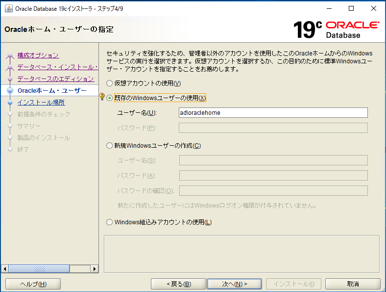Oracleホームユーザの指定のところで、「既存のWindowsユーザの使用」を選択し、ドメインのOracleホームユーザを指定する。
