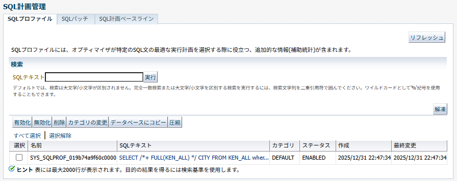 「パフォーマンス」→「SQL」→「SQL計画管理」画面からも、実装済みのSQLプロファイルの一覧に表示されるようになる(削除する場合はここで可能)。