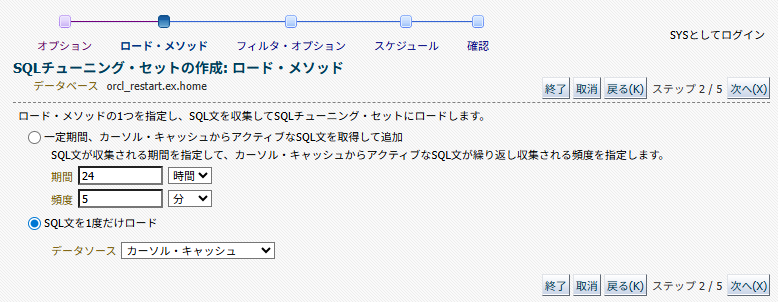 「SQLチューニング・セット名」を適当に設定し次へ進むと、SQL文をどのようにロードするかの選択が出る。