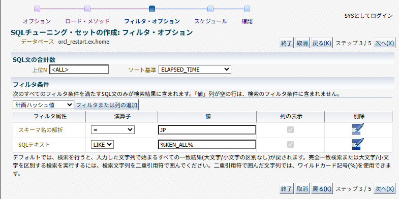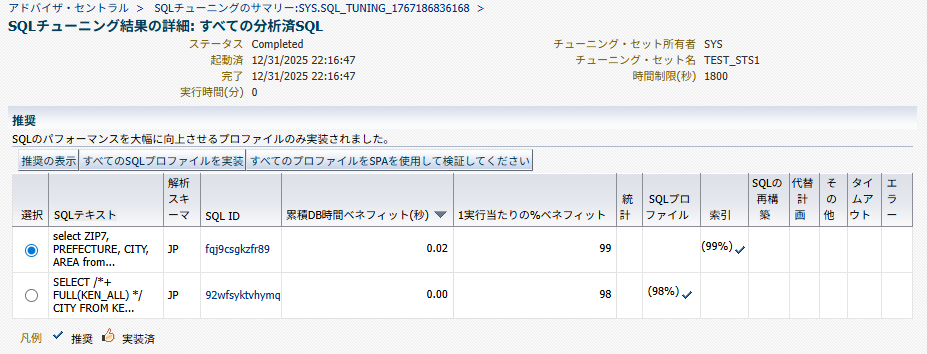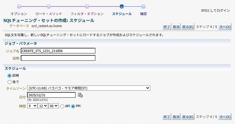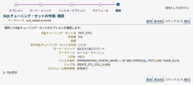 あとは、ジョブを実行すれば指定した条件に該当するSQLを含むSQLチューニングセットが作成される。
