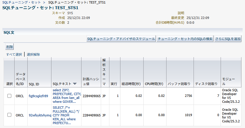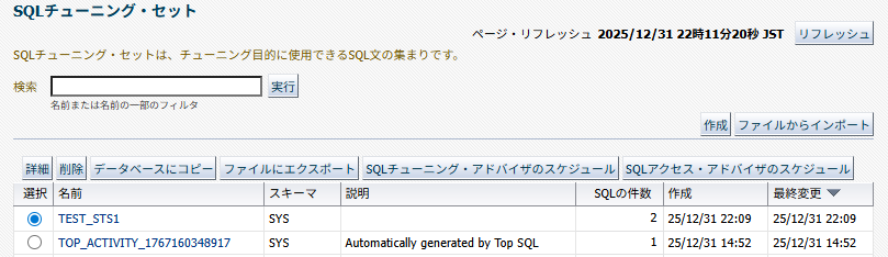 以下は作成されたSQLチューニングセット。不要なSQLが含まれている場合は削除しておく。