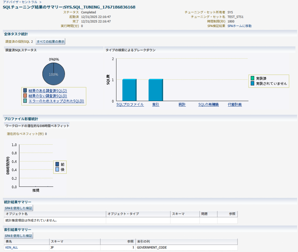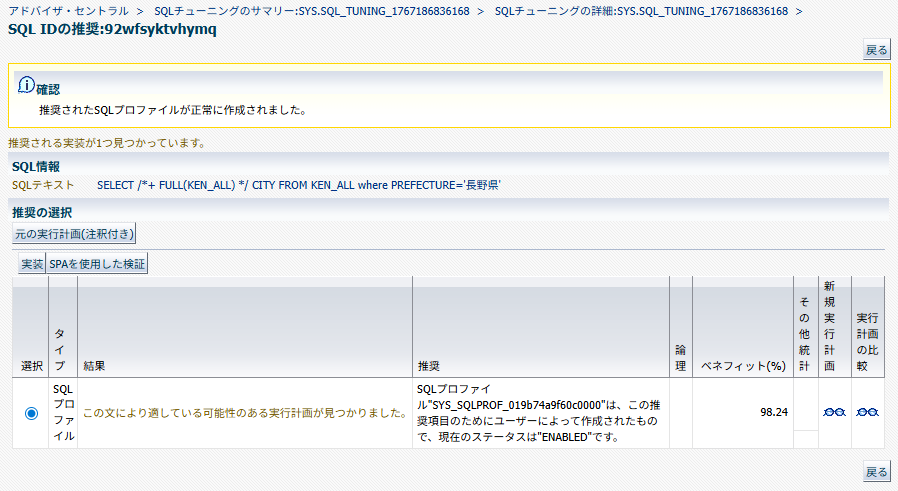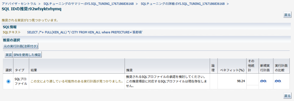 SQLチューニングセットやSQLチューニングアドバイザの実行は、「索引の作成が推奨される例」のところで一緒に実行しているので割愛する。