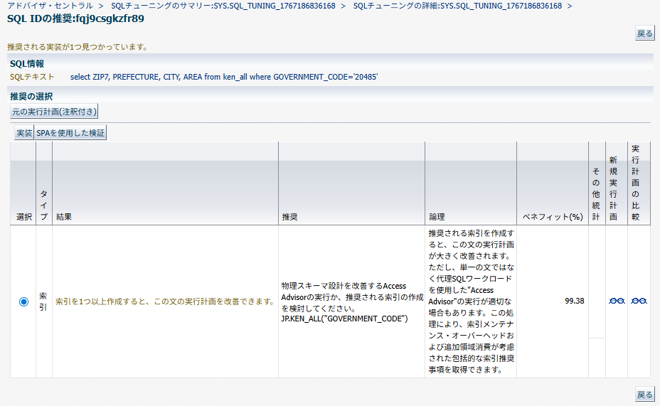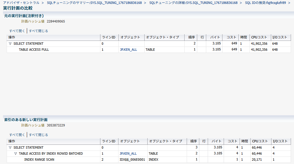 今回は索引の作成が推奨されており、索引の作成前後の実行計画の比較も可能。この場合、フルスキャンのコスト 649に対して索引スキャンではコストが4となっていて、99.38%の改善が見込まれることがわかる。