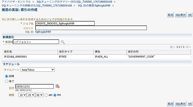 SQLチューニングセットの詳細画面から「SQLチューニング・アドバイザのスケジュール」ボタンを押下すれば、すぐにジョブ作成の画面に遷移できる。もしくは、EM画面の「パフォーマンス」→「SQL」→「SQLチューニング・アドバイザ」を開き、「SQLチューニング・セット」の欄に作成済みのSQLチューニングセットを指定すればよい。