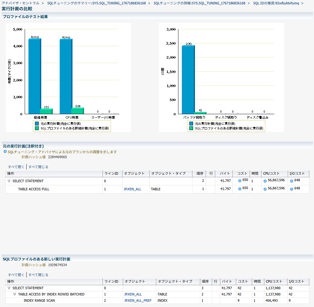 「実行計画の比較」から確認してみると、SQLプロファイルを実装した場合に索引スキャンが選択され、処理時間も大幅に改善することがわかる。