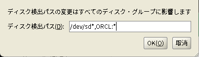 Grid Infrastructure のインストール時は、何も設定しないとディスクの検出パスにASMLIBのラベルが設定されていない。そのため、「検出パスの変更」ボタンを押して「/dev/sd*, ORCL:*」のようにラベル設定を追記する必要がある。